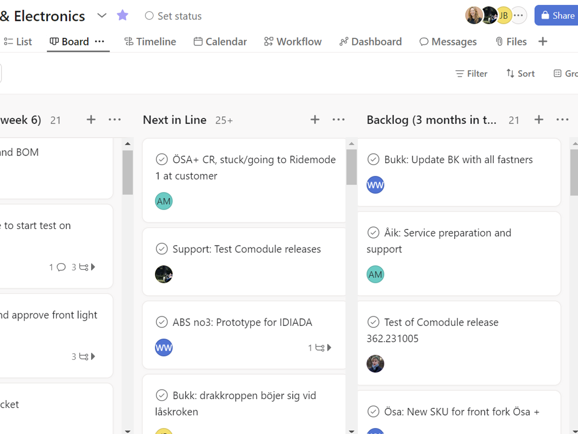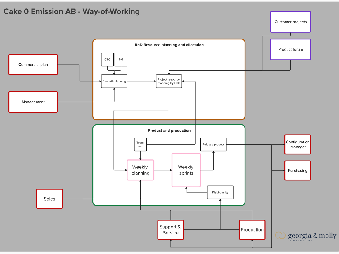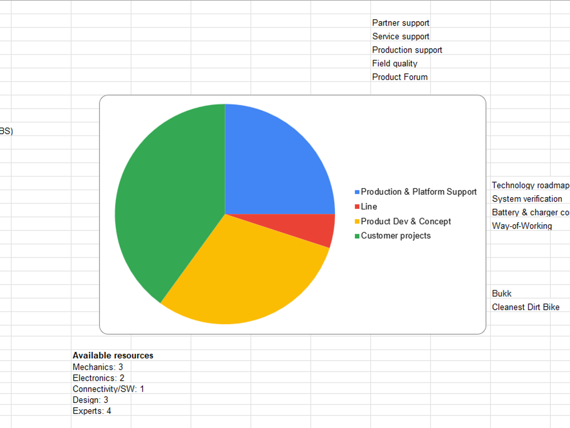 Before CAKE changed to a team based setup, product development was run through projects with assigned resources from the different disciplines: electronics, mechanics, design and software. In addition there were shared resources such as a homologation expert and prototype builder. These were not assigned to a project but had to navigate themselves or rely on the manager for guidance.